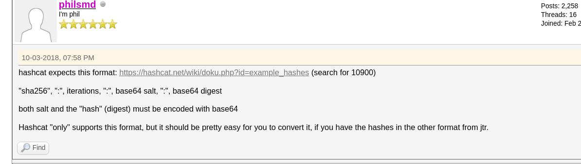 hashcat -m 10900 hash /usr/share/wordlists/rockyou.txt -D 2