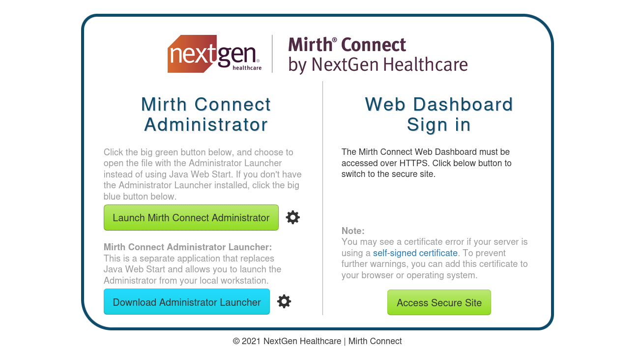 Bên trong là trang sign in, Launch Mirth Connect Administrator cho phép tải xuống file webstart.jnlp