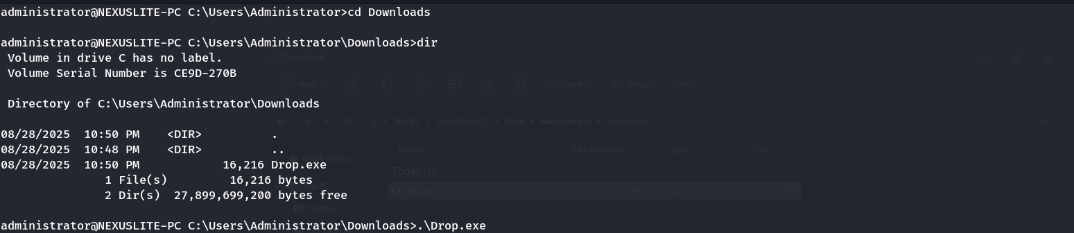 └─$ scp /home/kali/Downloads/test/Drop.exe administrator@172.16.254.10:/C:/Users/Administrator/Downloads/Drop.exe