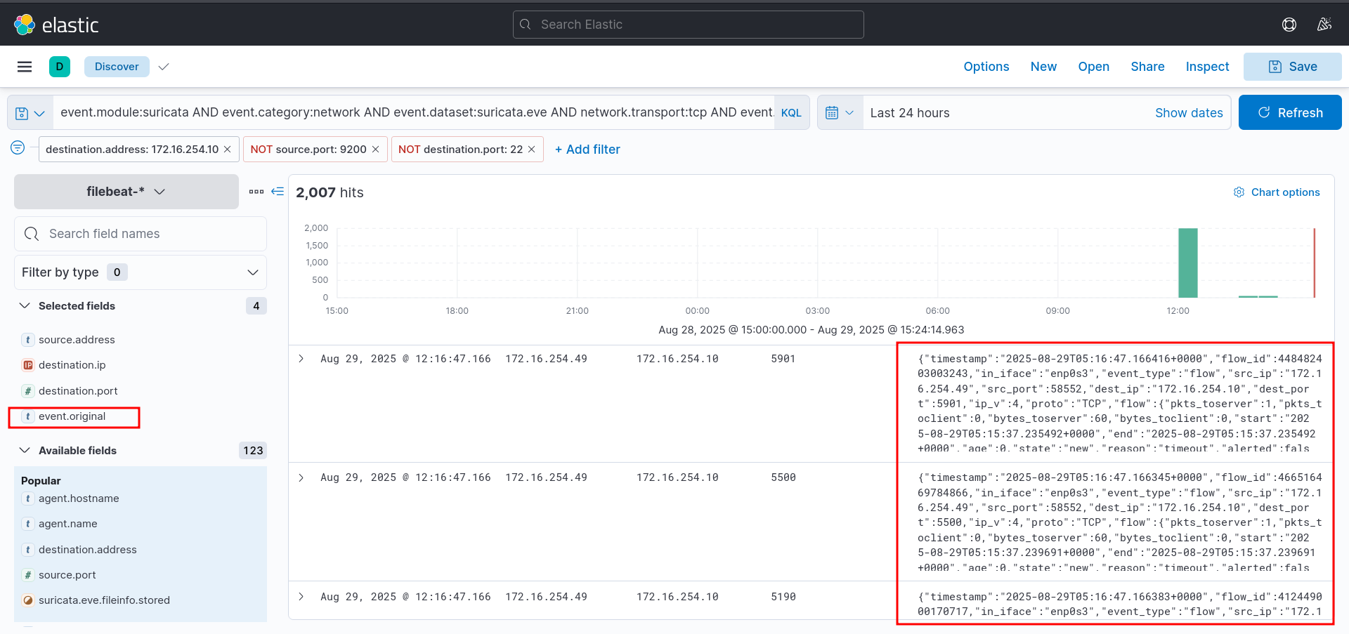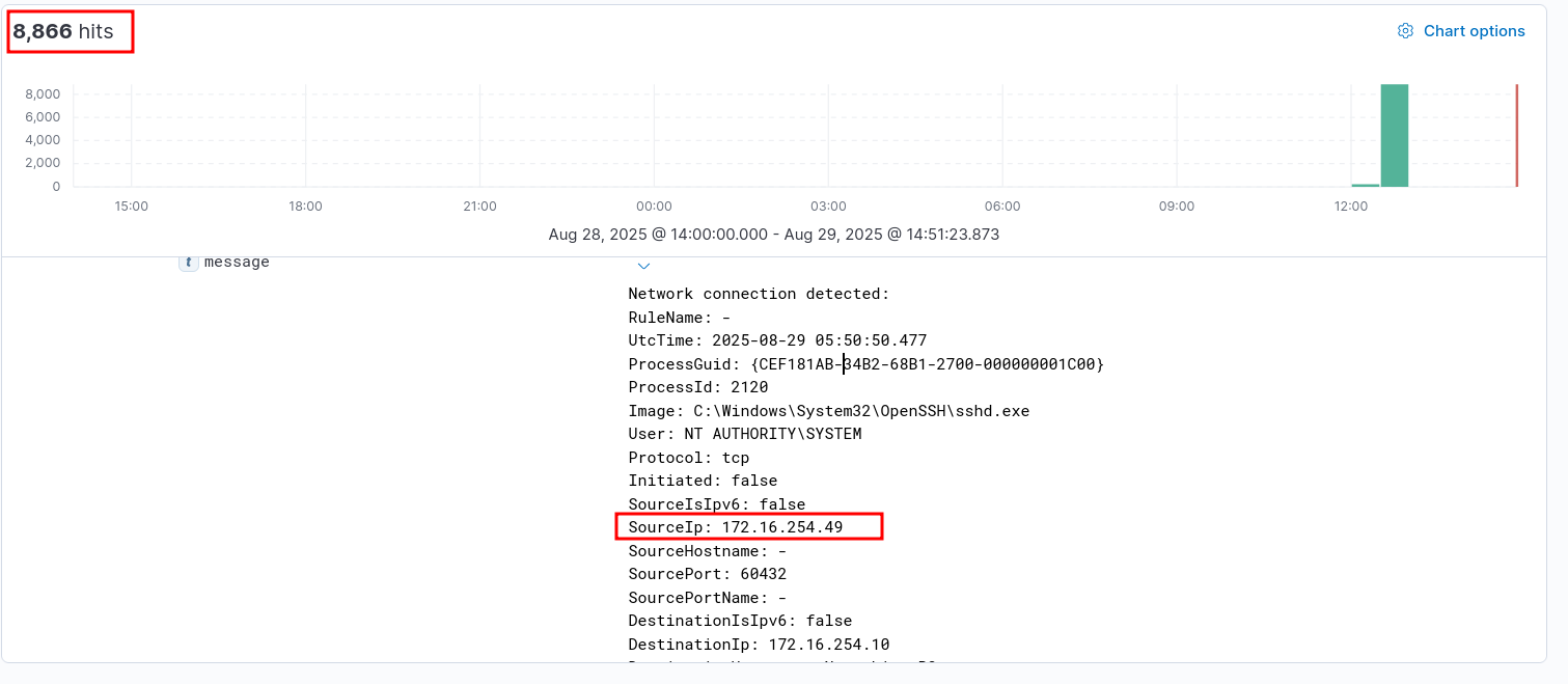 Kết quả trả về có 8866 dòng log tương ứng và ip thực hiện ở đây là ip: 172.16.254.49 và đây cũng chính là ip attacker. Việc có hàng nghìn kết nối TCP từ cùng một IP vào port 22 cho thấy rõ brute-force SSH attack.