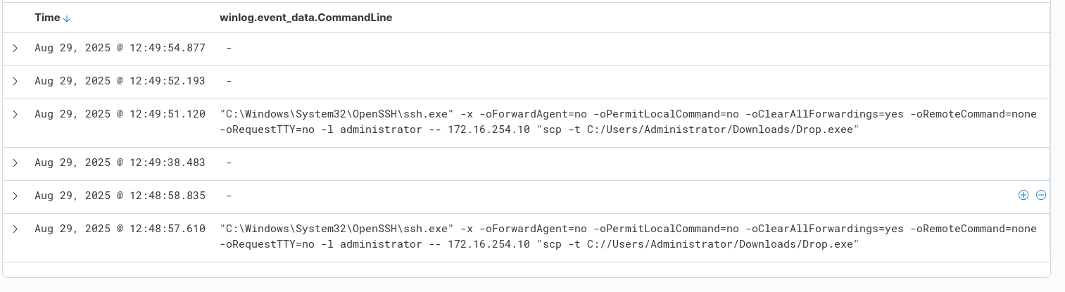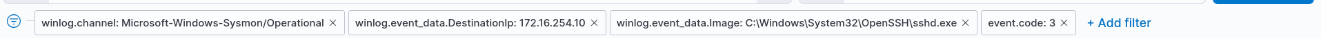 Tiếp tục lọc theo winlog.event_data.Image: C:\Windows\System32\OpenSSH\ssh.exe