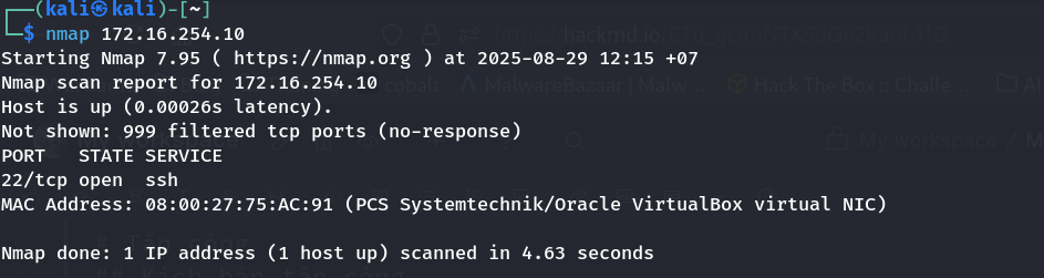 Sau khi mình scan với nmap, phát hiện ra 1 cổng đang mở là ssh